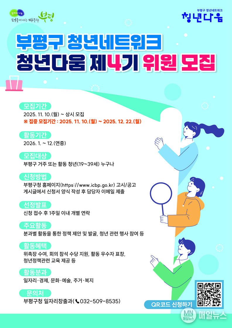 [매일뉴스] 부평구(구청장 차준택)는 12월 22일까지 ‘부평구 청년네트워크-청년다움’ 제4기 위원을 집중 모집한다고 밝혔다.