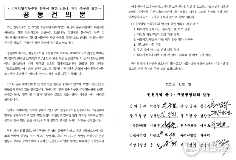 그러면서 “국민이 더 안전하고 쾌적한 보행 환경을 누릴 수 있도록, 개인형 이동 수단의 안전에 관한 법률 제정을 조속히 추진해 주실 것을 인천광역시 군수·구청장 공동의 뜻으로 건의한다.”라고 덧붙였다.