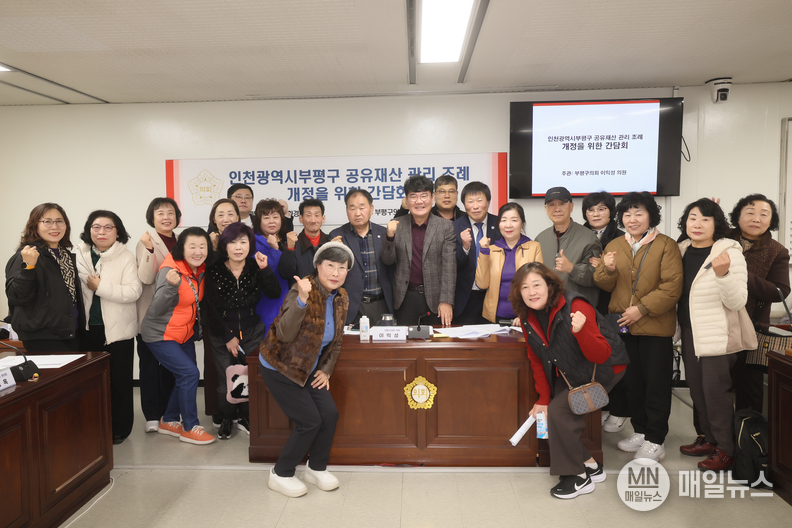 [매일뉴스] 인천 부평구의회(의장 안애경)는 11월 14일 부평구의회 도시환경위원회실에서 이익성 의원(국민의힘, 부평2·5·6, 부개1, 일신동)이 「인천광역시부평구 공유재산 관리 조례 개정」을 위한 간담회를 개최했다고 밝혔다.