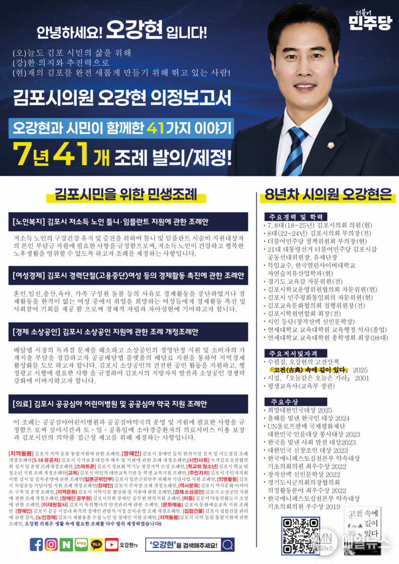 8년차 시의원인 오강현 의원이 의정보고서를 만들어 주민들과 소통하고 있다. 매일 아침과 저녁 거리와 지하철 역에서 주민들에게 지금까지의 김포시와 지역구를 위해 활동한 핵심적인 의정활동 내용을 정리하여 주민들을 만나고 있다. 그 내용을 살펴 보니, 민선7기와 8기에 걸친 7년의 의정활동 기간 조례 발의 41건, 5분발언과 시정질의 39번, 주요 수상과 임명장은 80여개를 받았다는 내용이 주된 내용이다.