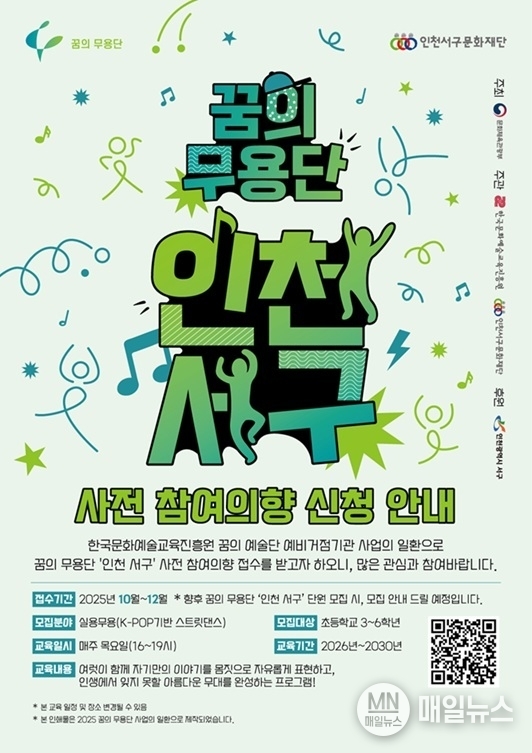 ‘꿈의 무용단’ 사전 참여의향 접수는 온라인 링크(https://url.kr/fsa981)를 통해 손쉽게 참여할 수 있다. 자세한 내용은 인천서구문화재단 홈페이지(www.iscf.kr) 또는 전화(032-510-6072)를 통해 확인 가능하다.