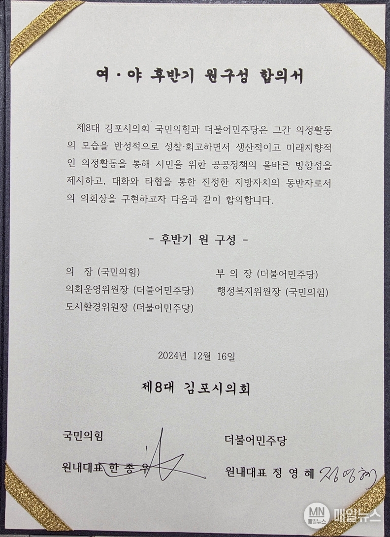 2024년 12월 16일, 김포시의회는 양당 원내대표가 서명한 여·야 후반기 원구성 합의서를 통해 국민의힘이 의장·행정복지위원장, 더불어민주당이 부의장·의회운영위원장·도시환경위원장을 맡기로 명확히 합의했다. 이는 김포시의회 안정적 운영을 위한 책임 있는 약속이었다.