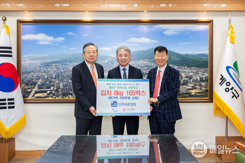 [매일뉴스] 인천 계양구(구청장 윤환)는 26일, 인천 세종병원(이사장 박진식)이 지역 내 취약계층의 건강한 식생활을 위해 김치(8kg) 165박스(환가액 700만 원 상당)를 기탁했다고 밝혔다.