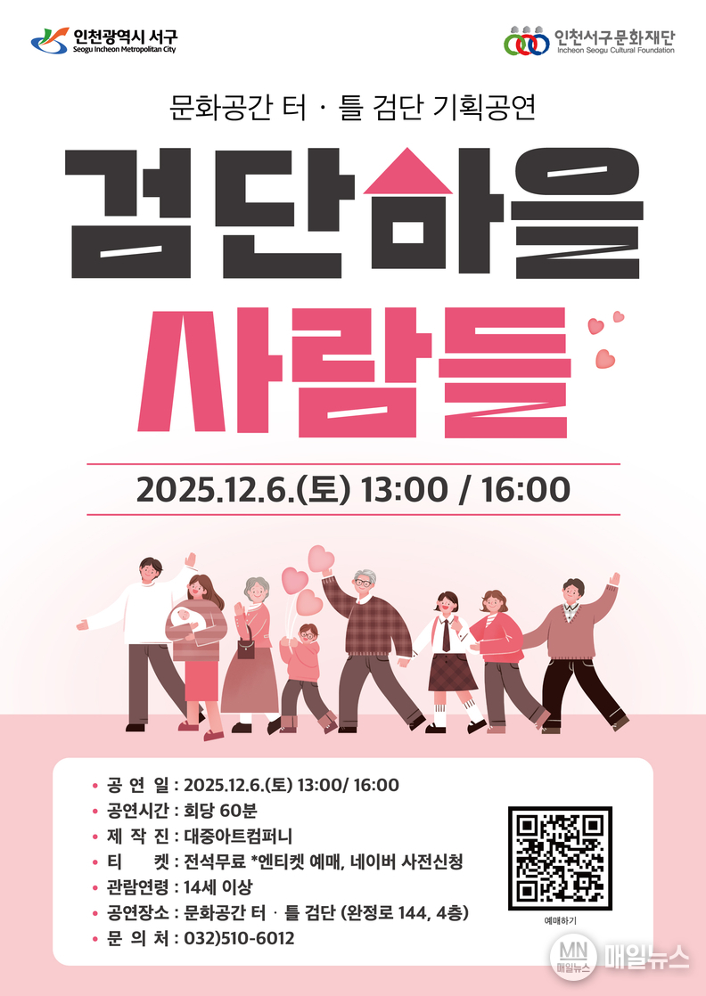 연극 ‘검단마을 사람들’은 12월 6일(토) 오후 1시와 4시, 총 2회에 걸쳐 진행되며 러닝타임은 약 60분이다. 전석무료로 관람 가능하며, 자세한 공연 정보는 인천서구문화재단 홈페이지(www.iscf.kr)에서 확인할 수 있다. 예매는 엔티켓(www.enticket.com)에서 진행된다.