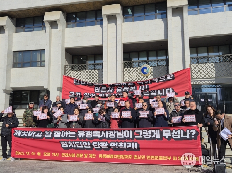 인천지역 50여 개 시민단체가 30일 인천시청 앞에서 기자회견을 열고, 유정복 인천시장에 대한 검찰의 공직선거법 위반 기소를 “정치적 탄압”으로 규정하며 즉각 중단을 촉구했다.