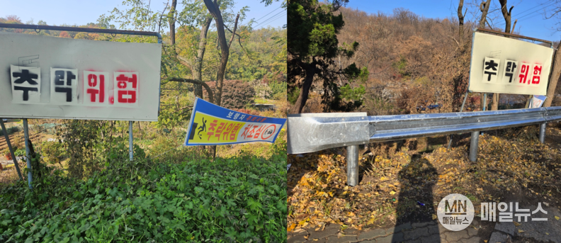이 도로는 차량이 일반 우회전 각도로 진입할 경우 약 10m 아래로 추락할 위험이 있어, 주민들이 자비로 ‘추락 위험’ 안내문을 설치할 정도로 사고 위험이 높았던 곳이다.
