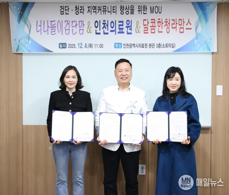 인천광역시의료원(의료원장 장석일)이 12월 4일(목), 인천 지역 대표 육아 커뮤니티인 ‘너나들이 검단맘’(매니저 이수진) 달콤한 청라맘스(매니저 조은혜)와 지역 육아환경 개선과 가족 건강을 위한 상호협력 협약을 체결했다.
