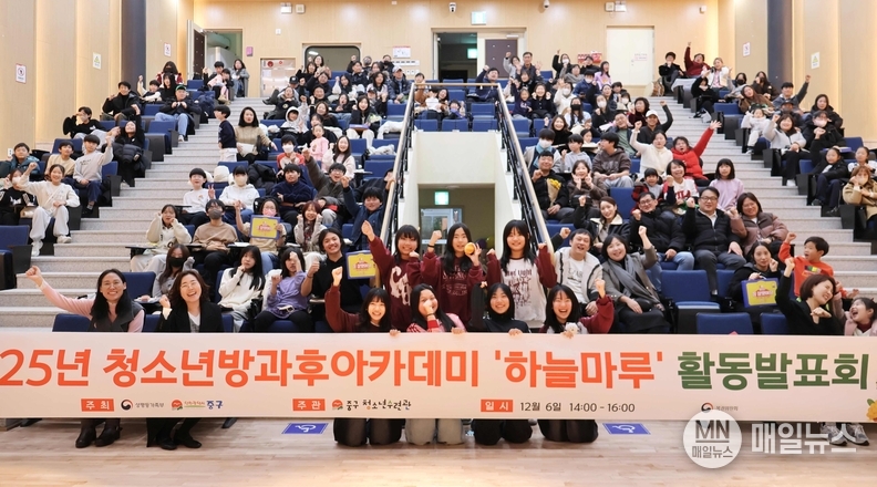 [매일뉴스] 인천중구시설관리공단(이사장 손영식)에서 운영하는 중구청소년수련관은 지난 6일 청소년방과후아카데미 ‘하늘마루’의 한 해 활동을 마무리하고 축하하기 위해 ‘2025 청소년방과후아카데미 활동 발표회’를 개최했다.