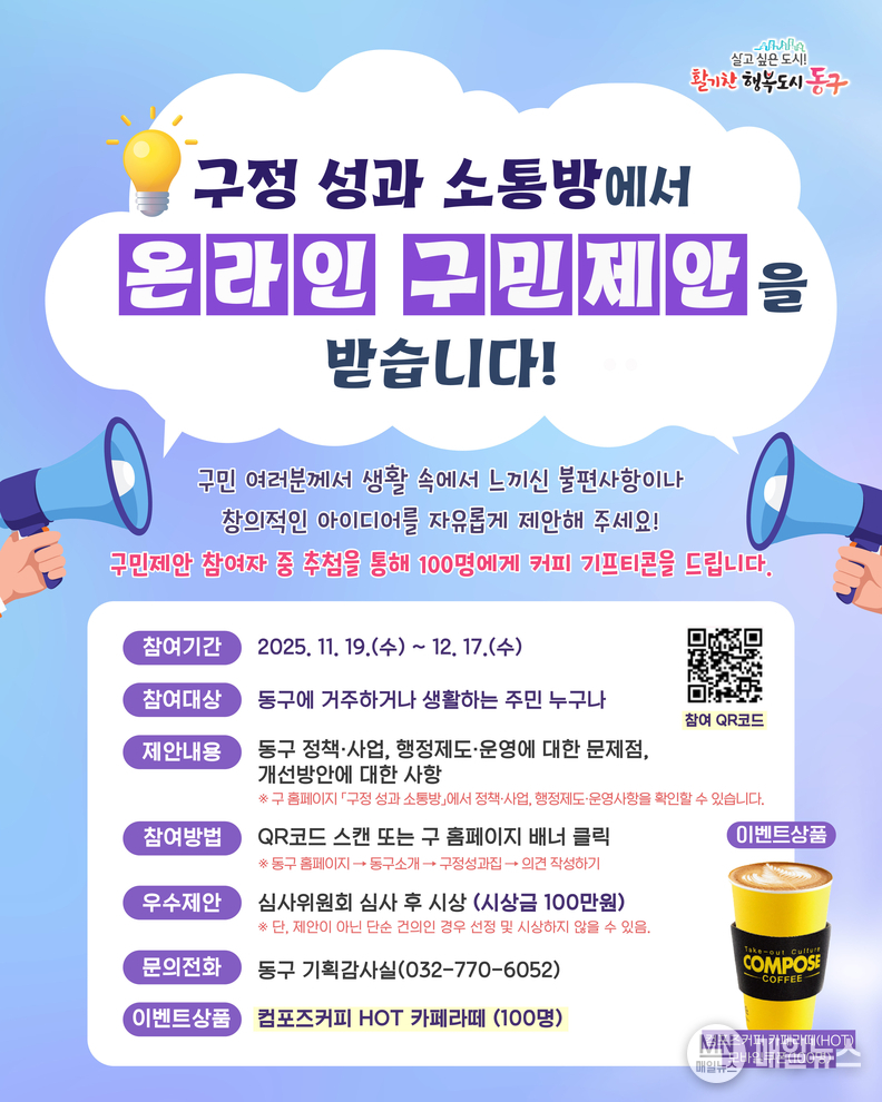 [매일뉴스] 인천 동구(구청장 김찬진)는 구민이 생활 속에서 느끼는 불편과 창의적인 아이디어를 자유롭게 제안할 수 있는 온라인 창구‘구정 성과 소통방’을 개설하고 의견을 접수한다고 밝혔다.