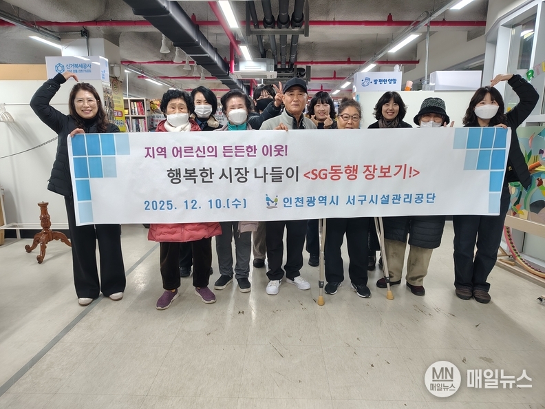 [매일뉴스] 인천 서구시설관리공단(이사장 우영환)은 지난 10일 신거북시장 일대에서 거동이 불편해 장보기가 어려운 지역 어르신 5명을 모시고 ‘행복한 시장 나들이, SG동행 장보기!’ 행사를 개최했다.