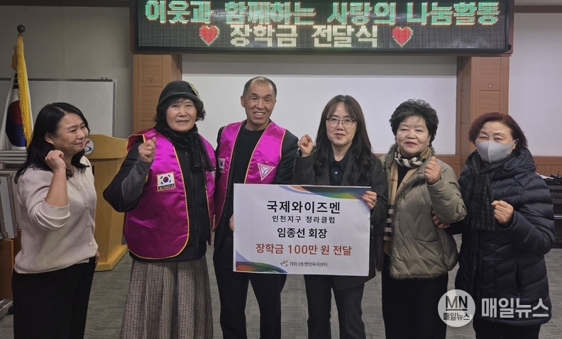 [매일뉴스] 국제와이즈멘 인천지구 청라클럽 임종선 회장은 지난 17일 가좌3동 저소득 청소년을 위한 장학금 100만 원을 가좌3동 지역사회보장협의체(공동위원장 박은선, 이춘자)에 전달하였다.
