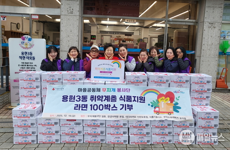 [매일뉴스] 미추홀구 용현3동(동장 신상일)은 19일 마을 공동체 무지개봉사단(모임 리더 김지안)으로부터 지역사회 나눔 실천의 일환으로 라면 100상자를 전달받았다.