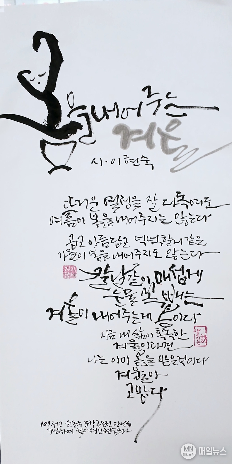 이현숙 캘리그라피 명인장은 최근 윤동주 탄생 109주년 기념 전국 공모전에서 「봄을 내어주는 겨울」 외 2편의 시로 최우수상을 수상하며 다시 한번 작품성을 인정받았다.