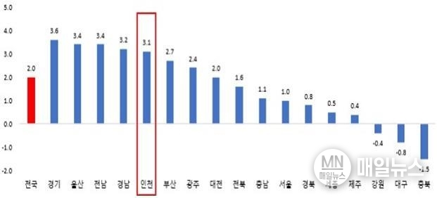 [매일뉴스]국가데이터처가 12월 23일 발표한 ‘2024년 지역소득(잠정)’ 추계 결과에 따르면, 인천시의 경제규모는 126조 원에 달한 것으로 나타났다. 전년 대비 실질 경제성장률은 3.1%로 전국 평균 경제성장률 2.0%를 웃돌았으며, 전국 17개 시·도 가운데 5위, 특·광역시 중에서는 2위를 기록했다.