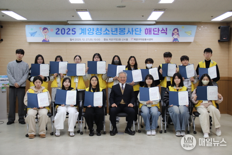 [매일뉴스] 인천 계양구 자원봉사센터(센터장 홍순석)는 12월 27일 계양구청 신비홀에서 ‘2025 제1기 계양청소년봉사단’ 해단식을 개최하고, 한 해 동안 이어온 활동을 성공적으로 마무리했다.