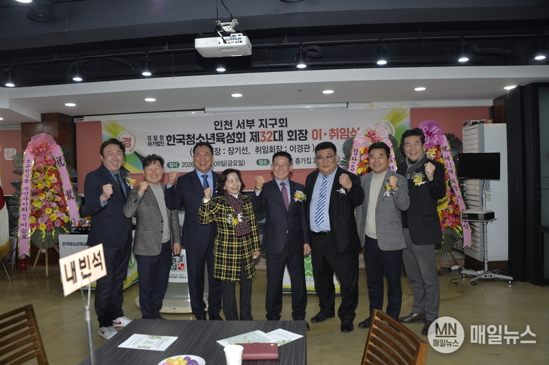 (매일뉴스= 인천 검단) 조종현 기자 = 한국청소년육성회 인천서부지구회 제32대 회장 이·취임식이 2026년 1월 9일, 인천 서구 검단 종가집 2층에서 내빈과 회원들이 참석한 가운데 성황리에 개최됐다.
