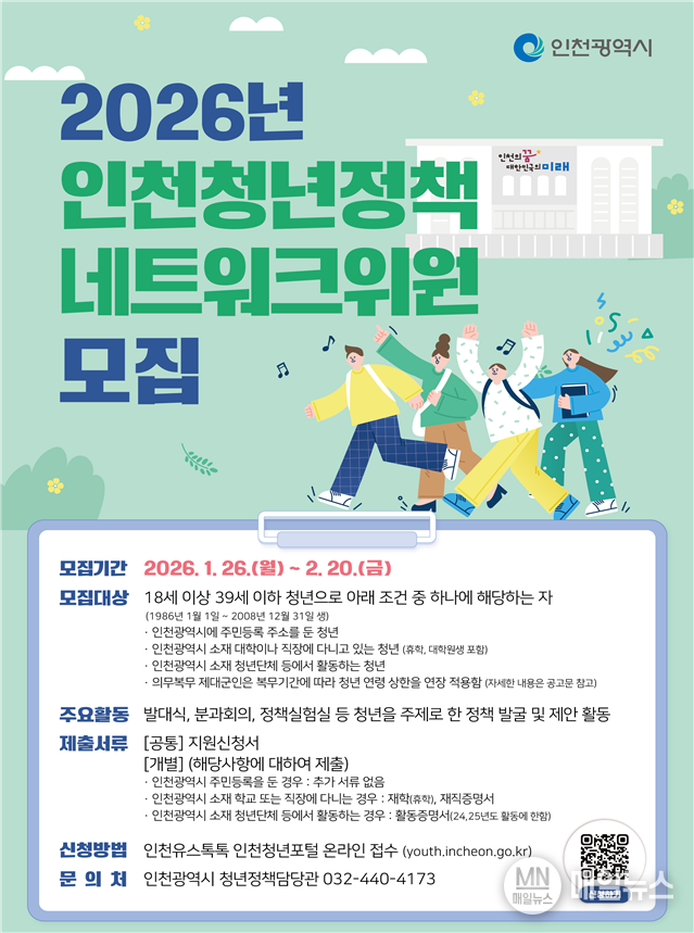 인천광역시(시장 유정복)는 청년이 정책의 수혜자를 넘어 직접 정책을 기획하고 실험하는 주체로 참여할 수 있도록 「2026년 인천청년정책네트워크」 청년위원을 1월 29일부터 2월 20일까지 공개 모집한다고 밝혔다.