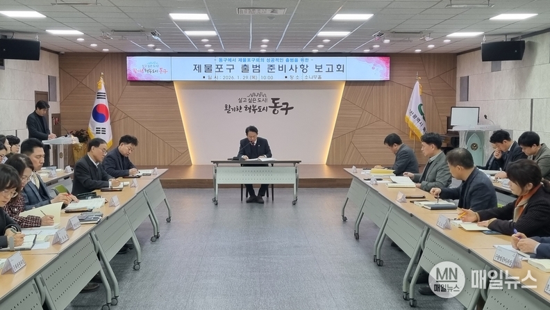 [매일뉴스] 인천 동구(구청장 김찬진)는 지난 29일 구청 소나무홀에서 ‘제물포구 출범 준비사항 보고회’를 개최했다고 밝혔다. 보고회는 김찬진 동구청장이 직접 주재했으며 구청 전 부서장들이 참석해 심도있게 진행됐다.