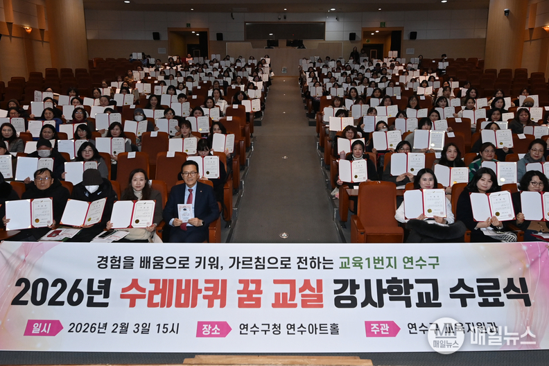[매일뉴스] 연수구(구청장 이재호)는 지난 3일 구청 연수아트홀에서 ‘2026년 수레바퀴 꿈 교실 강사학교’ 수료식을 성황리에 개최했다.