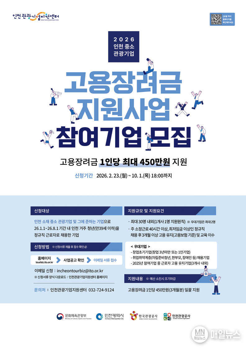 [매일뉴스] 인천광역시(시장 유정복)와 인천관광공사(사장 유지상)는 지역 중·소 관광기업의 안정적인 인력 운영을 지원하고, 인천 거주 청년의 지속 가능한 일자리 창출을 위해「2026년 인천 중·소 관광기업 고용장려금 지원사업」을 추진한다고 밝혔다.