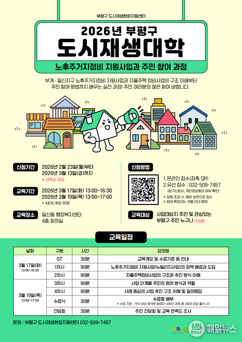 [매일뉴스] 부평구는 오는 3월 13일까지 ‘2026년 부평구 도시재생대학’ 교육생을 모집한다.