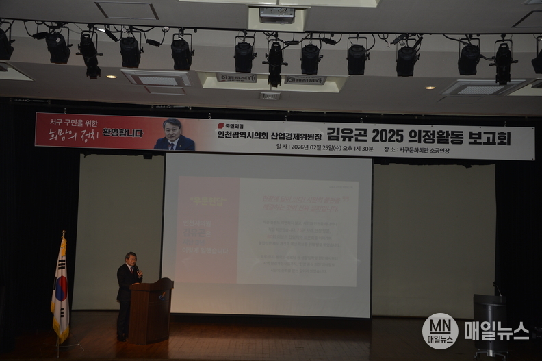 (매일뉴스=인천 서구) 조종현 기자 = 김유곤 인천시의원(산업경제위원장)이 2월 25일 인천서구문화회관 소강당에서 의정보고회를 개최하고 그간의 의정활동 성과와 향후 계획을 시민들과 공유했다.