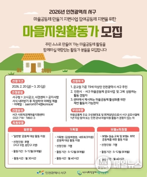[매일뉴스] 인천 서구(구청장 강범석)는 주민 스스로 지역 문제를 해결하고 마을공동체의 성장을 도모하는 ‘2026년 서구 마을공동체 만들기 지원사업’ 참여 공동체와 마을지원활동가를 모집한다.