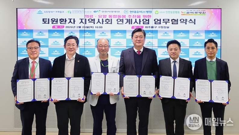 [매일뉴스] 인천 미추홀구(구청장 이영훈)는 지난 26일 지역 내 5개 의료기관과 ‘퇴원 환자 지역사회 연계사업’ 추진을 위한 업무협약을 체결했다.