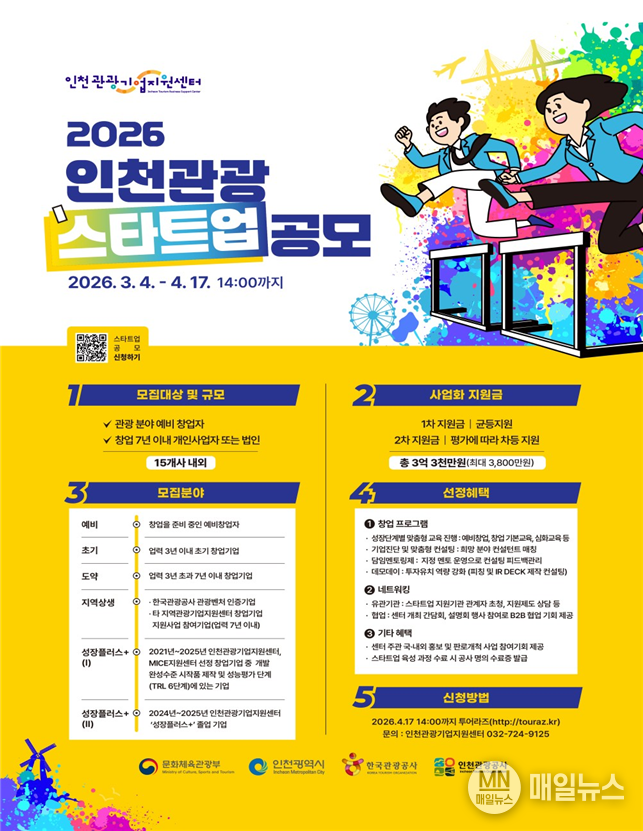 인천광역시(시장 유정복)와 인천관광공사(사장 유지상)는 오는 4월 17일까지 지역 내 유망 관광 창업 초기 기업을 발굴‧지원하기 위해 「2026 인천 관광스타트업 모집」 공모를 실시한다고 밝혔다.