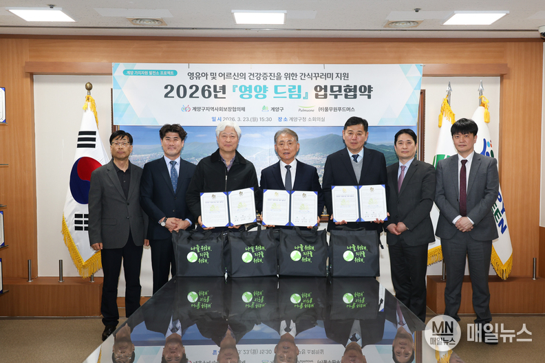 [매일뉴스] 인천 계양구(구청장 윤환)와 계양구지역사회보장협의체(민간공동위원장 윤성묵), ㈜풀무원푸드머스(대표 문현기)는 23일 저소득층 영유아와 돌봄이 필요한 노인가구의 건강한 식생활 지원을 위한 ‘영양드림’ 업무협약을 체결했다.