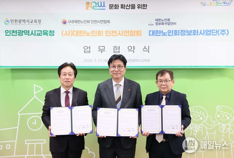 [매일뉴스] 인천광역시교육청(교육감 도성훈)은 31일 (사)대한노인회 인천광역시연합회, 대한노인회 정보화사업단과 ‘읽걷쓰 시민문화 확산을 위한 업무협약’을 체결했다.