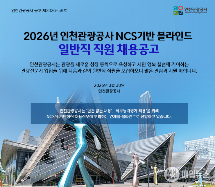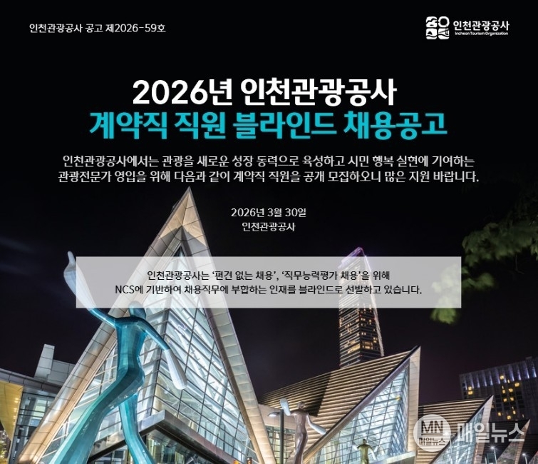 [매일뉴스] 인천관광공사(사장 유지상)는 2026년도 신규직원 공개채용을 위한 원서접수를 오는 4월 13일까지 진행한다고 밝혔다.
