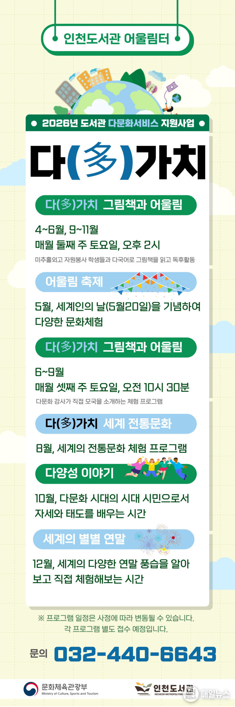 인천광역시(시장 유정복) 인천도서관은 어린이를 대상으로 다양한 문화를 이해하고 존중하는 태도를 기를 수 있도록 2026년 도서관 다문화서비스 지원사업 「다(多)가치」를 운영한다고 밝혔다.