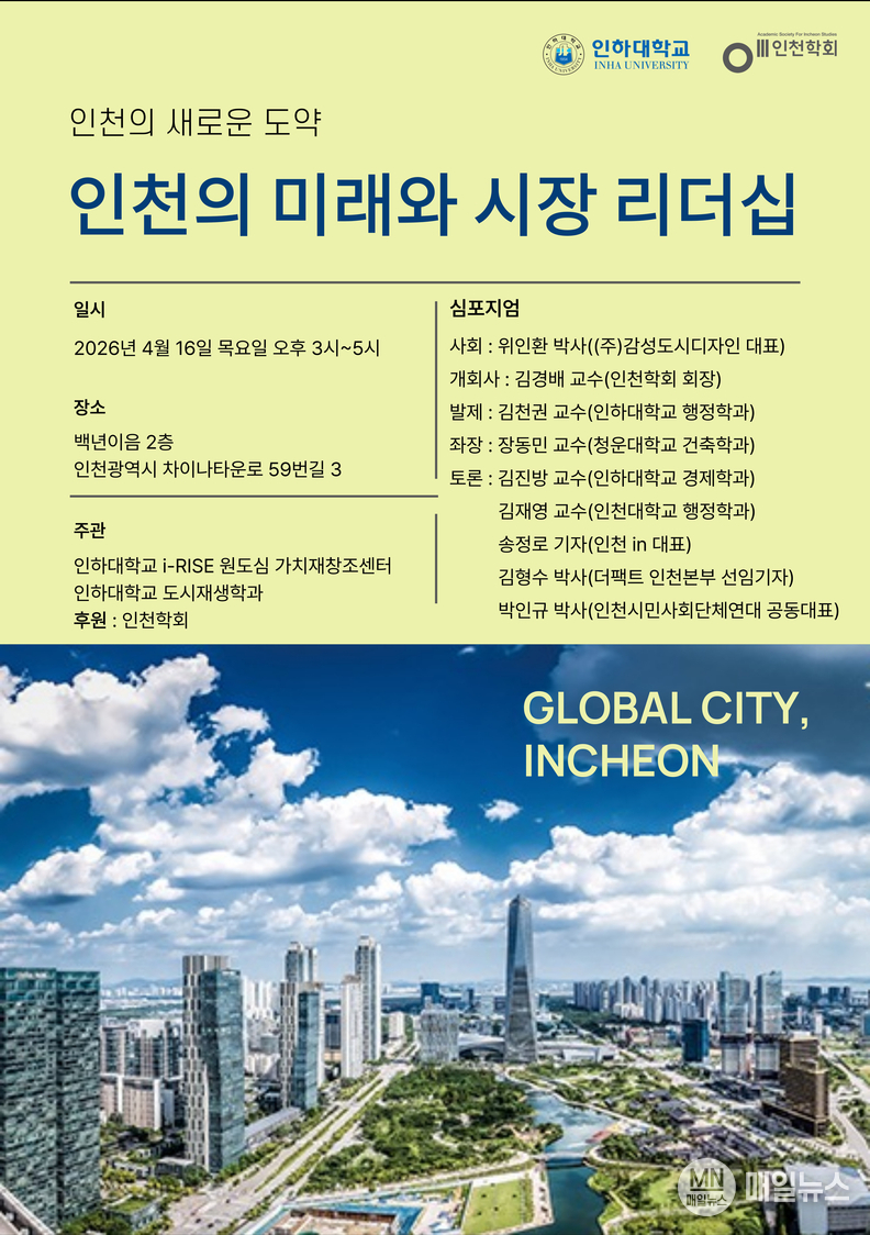 주최 측은 “인천은 공항과 항만을 기반으로 한 국제도시로 성장해 왔지만, 앞으로는 도시 브랜드와 정책 리더십이 경쟁력을 좌우하는 시대”라며 “이번 심포지엄이 인천의 미래 전략과 리더십 방향을 구체화하는 계기가 될 것”이라고 밝혔다.