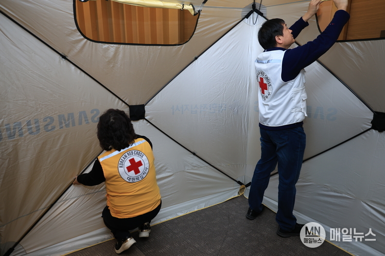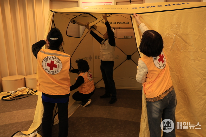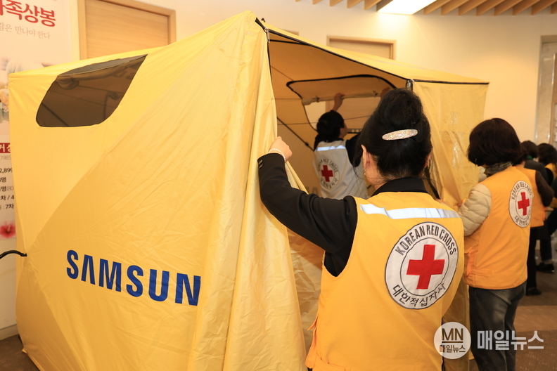 이날 훈련에 참가한 141명의 봉사원들은 실제 재난 현장을 가정해 임시 거주 시설인 ‘이재민 쉘터’를 조립하고 철수하는 전 과정을 반복 숙달했다. 1분 1초가 급박한 현장에서 봉사원들의 체계적인 기동력을 끌어올리기 위한 조치다.