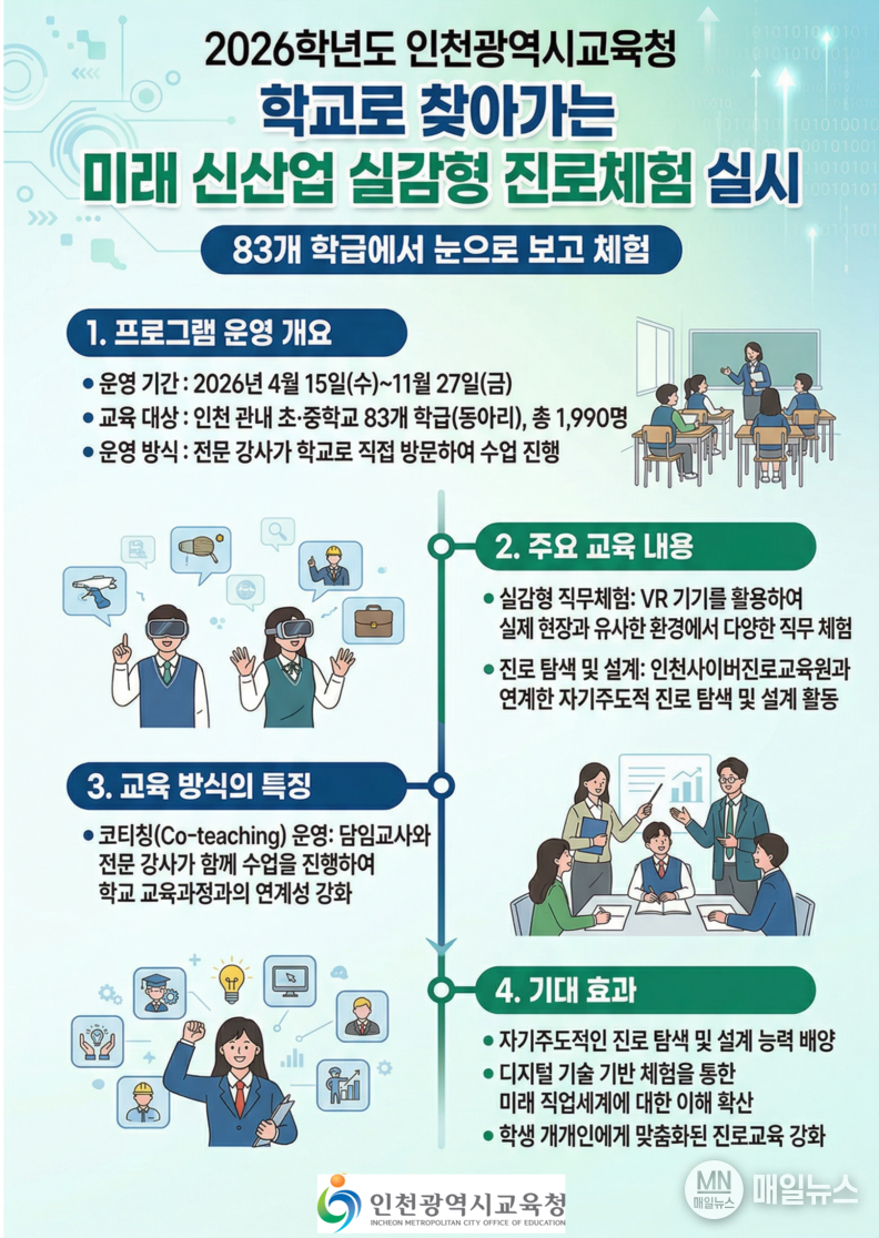 인천시교육청 관계자는 “이번 프로그램이 학생들에게 미래 직업세계에 대한 이해를 넓히고, 스스로 진로를 설계하는 힘을 키우는 계기가 되길 바란다”며 “앞으로도 디지털 기술을 활용한 체험 중심 진로교육을 확대해 맞춤형 진로교육을 강화하겠다”고 밝혔다.