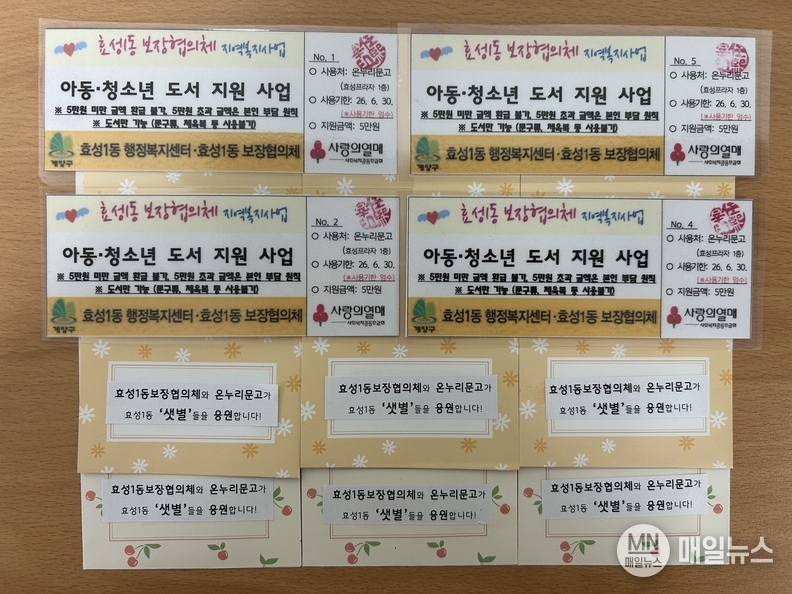 [매일뉴스] 인천시 계양구 효성1동 보장협의체(위원장 이은곤)는 13일 지역 내 저소득 아동·청소년 20가구를 대상으로 각 5만 원 상당의 도서쿠폰을 전달했다.