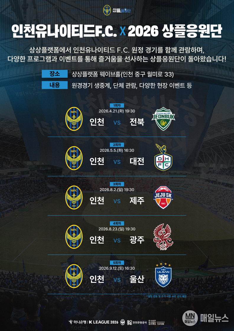 [매일뉴스] 인천관광공사(사장 유지상)는 인천유나이티드(대표이사 조건도)와 함께 ‘인천유나이티드F.C. X 2026 상플응원단’을 공동 개최한다고 밝혔다.