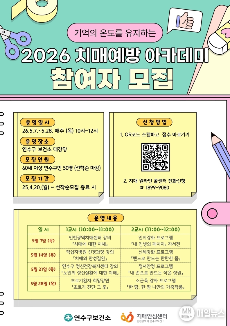 [매일뉴스] 연수구(구청장 이재호)는 다음 달 7일부터 28일까지 치매 발병 지연과 예방을 위한 ‘2026 치매예방 아카데미’를 운영한다.
