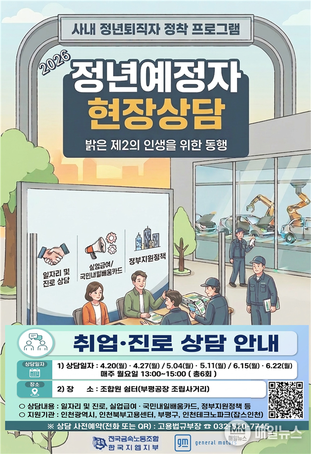 시는 최근 한국지엠 부평공장을 찾아 현장 설명회를 개최하고 정년퇴직 예정 근로자를 대상으로 맞춤형 지원에 나서고 있다. 한국지엠 부평공장은 올해 정년에 도달하는 1966년생을 시작으로 오는 2032년까지 약 1,750여 명의 근로자가 순차적으로 퇴직할 예정인 만큼, 체계적인 진로 설계와 재취업 지원이 필요한 상황이다.