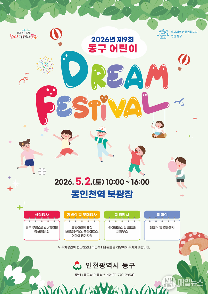 [매일뉴스] 인천 동구는 오는 2일 동인천역 북광장에서 제104회 어린이날을 맞아‘2026년 제9회 동구 어린이 Dream Festival’을 개최한다고 밝혔다.