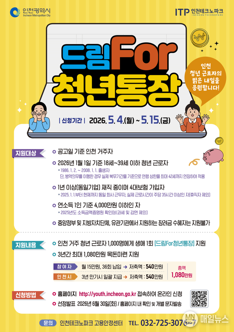 접수 기간은 5월 4일 오전 9시부터 5월 15일 오후 6시까지이며, 인천유스톡톡(인천청년포털) 홈페이지 누리집(https://youth.incheon.go.kr)에서 신청하면 된다.