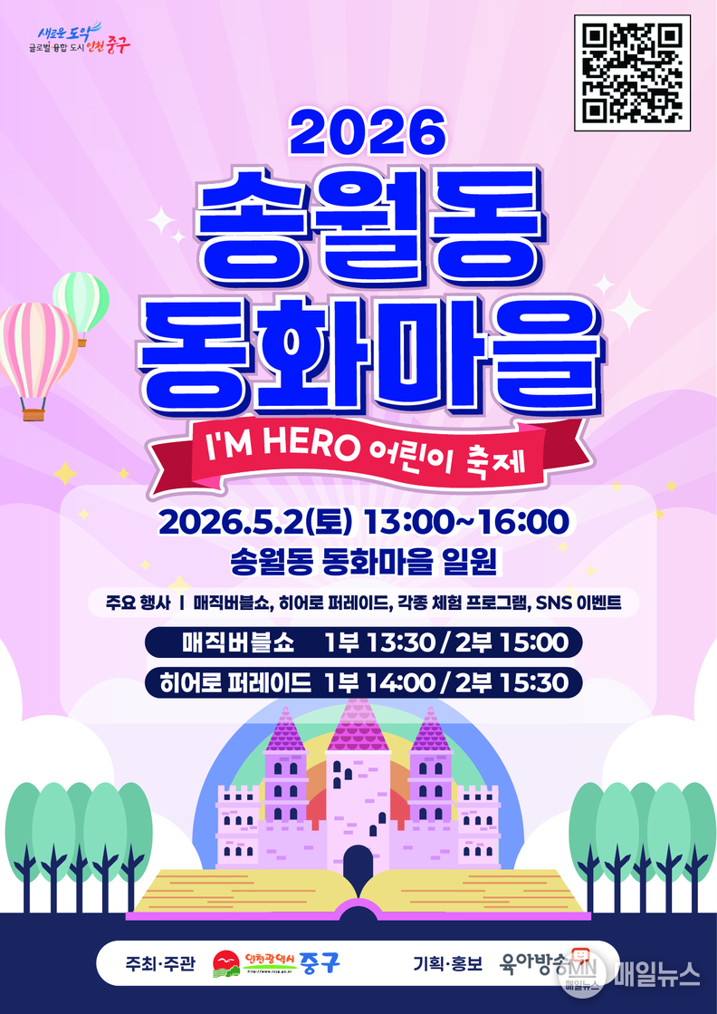 [매일뉴스] 인천시 중구는 어린이날을 맞아 오는 5월 2일 ‘2026년 송월동 동화마을 어린이 축제’를 개최한다고 밝혔다.