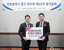 [매일뉴스] 인천시 중구(구청장 김정헌)는 인천중구의사회가 지역 내 어려운 이웃들을 돕기 위한 성금으로 100만 원을 기탁했다고 24일 밝혔다. 이번 이웃돕기 성금은 관내 취약계층을 돕기 위해 의사회 회원들이 자발적으로 십시일반 마음을 모아 마련한 것이라 그 의미를 더했다. 성금은 인천사회복지공동모금회를 통해 2026년 중구 지역 복지사업과 취약계층 생활 안정 지원을 위해 사용될 예정이다. 한편, 성금 전달식은 지난 20일 신포동에서 개최된 ‘2026년 중구의사회 제45차 정기총회’ 현장에서 진행됐다. 총회는 중구의사회 신은호 회장의 개회 선언을 시작으로 ▲의사 윤리강령 낭독 ▲김정헌 구청장과 배준영 국회의원의 축사 ▲성금 전달식 순으로 진행됐다. 신은호 회장은 “설 명절 이후 더 큰 소외감을 느낄 수 있는 이웃들에게 온정을 전하고자 회원들과 정성을 모았다”라며 “이번 후원이 지역사회의 어려운 분들에게 작은 위로가 되길 바란다. 앞으로도 지역사회와 상생하는 의료인 단체로서 나눔 문화 확산에 앞장서겠다”라고 밝혔다. 김정헌 중구청장은 “설 명절 전후로 잊지 않고 이웃사랑을 실천한 중구의사회에 진심으로 감사하다”라며 “소중한 마음이 추운 겨울 끝자락을 보내는 취