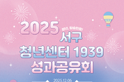 [매일뉴스] 인천시 서구(구청장 강범석)는 오는 12월 6일(토) ‘2025 서구 청년정책 성과공유회’를 개최한다고 밝혔다. 이번 성과공유회는 한 해 동안 진행된 서구 청년정책을 되돌아보고, 청년들이 직접 참여한 다양한 활동의 성과를 나누며, 청년들의 목소리를 축하하기 위해 마련됐다. 사전행사로 청년센터 서구1939에서 참여자들의 추억과 소감을 나누는 추억저장소 이벤트가 진행되며, 본행사에서는 청년성장 빌리지 체험, 포켓마켓 in 청년파크 플리마켓, 청년성장 어드벤처 퍼레이드, 네트워킹 파티 등 다채로운 체험과 이벤트가 이어진다. 행사 관계자는 “청년들이 서로 연결되고, 일상에서 벗어나 즐거움을 나누며 성장할 수 있는 기회가 되길 바란다”라며, “19세~39세 서구 청년 누구나 참여 가능하니, 많은 청년들의 관심과 참여를 기대한다”라고 전했다. 이번 성과공유회는 청년정책에 관심 있는 누구나 참여가 가능하며, 청년센터 서구1939 홈페이지(https://m.site.naver.com/1WmFM) 통해 사전 신청이 가능하다.